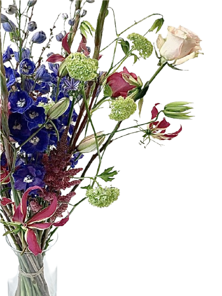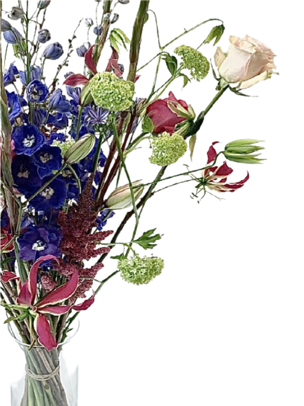 Omschrijving: plukboeket met rozen, gladiolen, gloriosa en delfinium