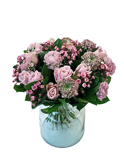 Omschrijving: roze boeket met rozen, ranonkels en bouvardia